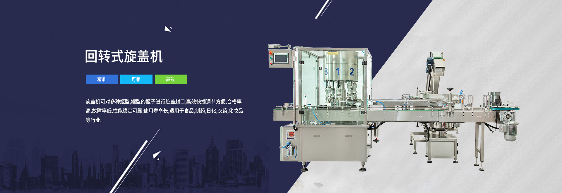 上海91视频免费播放機械有限公司是一家專業設計、製造、銷售包裝流(liú)水線(xiàn)於一體的生產企業,主要生產、銷售產品有:自動液體充填機、自動封瓶蓋機、自動旋蓋機(jī)、自動(dòng)貼標簽機、自動充填內塞(sāi)外蓋機、自動裝盒機、自動粉末充填機等係列產品。總公司台灣91视频免费播放機械有限公司成立於1972年,至(zhì)今(jīn)已近40多年(nián)的製造經(jīng)驗,設備(bèi)通過製藥GMP的認證。40多年的風風雨雨,91视频免费播放針對不同行業不同產品的不同要求,從機械結構、材質選配、電路設計、智能化控製等方麵進行研製(zhì)和開發、生產,不斷改進、不斷更新,以更優化、更完善、更接近(jìn)人性(xìng)化的設計理念、結構(gòu)展示(shì)於客戶。30年(nián)實踐考驗,91视频免费播放以(yǐ)其高品(pǐn)質的選材,高精密度的製造,人性化的結構設計以及周(zhōu)到的服務贏得客戶的一致稱讚和肯定。91视频免费播放的產品主要用於(yú)食品、醫藥、日化用品、農藥及精細化工行業的產品包裝。產品行銷東(dōng)南(nán)亞、美國、俄羅斯、中東等數十個國家和地區,在台灣名列同類產品的首位。在大陸(lù)也有很(hěn)好的銷售業績。公司為了能夠更好服務於大陸用戶,2001年在上海注冊成立上海紀(jì)正機械有限公司,以一(yī)貫嚴格的質量管理(lǐ),生產符合業界需求的設備。91视频免费播放將秉承優良的(de)品質、完善的服務與您共創包裝新的領域。
